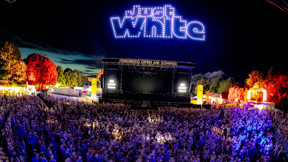 Einer der Highlight-Momente findet gegen 23 Uhr statt: 300 Drohnen steigen in den Friedberger Nachthimmel auf und lassen ihn kilometerweit über Hessen erstrahlen. HIT RADIO FFH hat exklusiv für „FFH-Just White!“ zusammen mit der Firma „Showmatrix“ aus Limburg – die zuletzt eine von Deutschlands größten Drohnenshows auf der Meisterfeier von Fußball-Bundesligist Bayer Leverkusen gestaltet hat – eine emotionale 3D-Show konzipiert. Die über 13.000 Besucherinnen und Besucher dürfen sich rund 15 Minuten lang über spektakuläre Motive wie z.B. ein Herz, einen Regenbogen oder dem Just White- und FFH-Logo, mit einer Breite von über 120 Metern, am Himmel und einer darauf abgestimmten musikalischen Untermalung freuen.